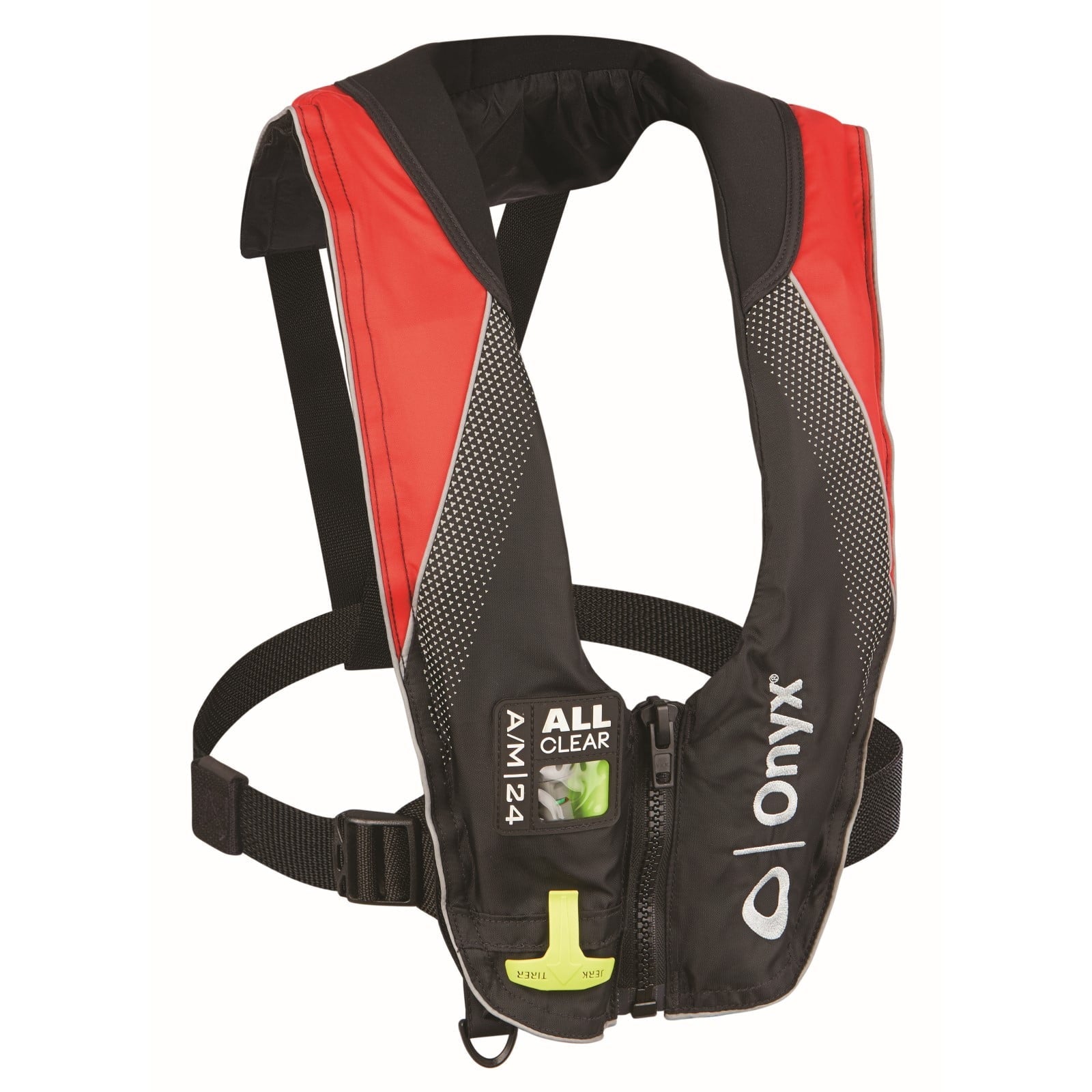 The Onyx AM-24 All-Clear inflatable life jacket has everything except the bulk. This lightweight, low profile inflatable life jacket has an ALL CLEAR viewing window that shows red or green for an at-a-glance look to make sure the inflatable life jacket is properly armed and ready to use. GREEN: Good to go. RED: Need to Rearm. This U.S. Coast Guard approved inflatable life jacket converts from Automatic and Manual to Manual Only Inflation for those times when you want the convenience of kayaking, canoeing, or fly-fishing activities and there is a good chance you may get wet or could end up in the water. If this happens, you just pull the 'inflate' cord so the vest will inflate and keep you floating safely. Features a comfortable wide neckline with soft neoprene for all day comfort, a 'Secure Pull' inflation handle that tucks away when not needed, and a 'Webbing Lock' that rolls straps up and holds them together to keep them in place. The front zipper closure provides a secure fit, and reflective piping adds visibility. Inflatable life jackets can be reused after each inflation. Always read your Owner's Manual for the proper way to initially arm your life jacket with the CO2 cartridge, and how to re-arm it after it has been inflated. Use Onyx Rearming Kit #1357 for this product.