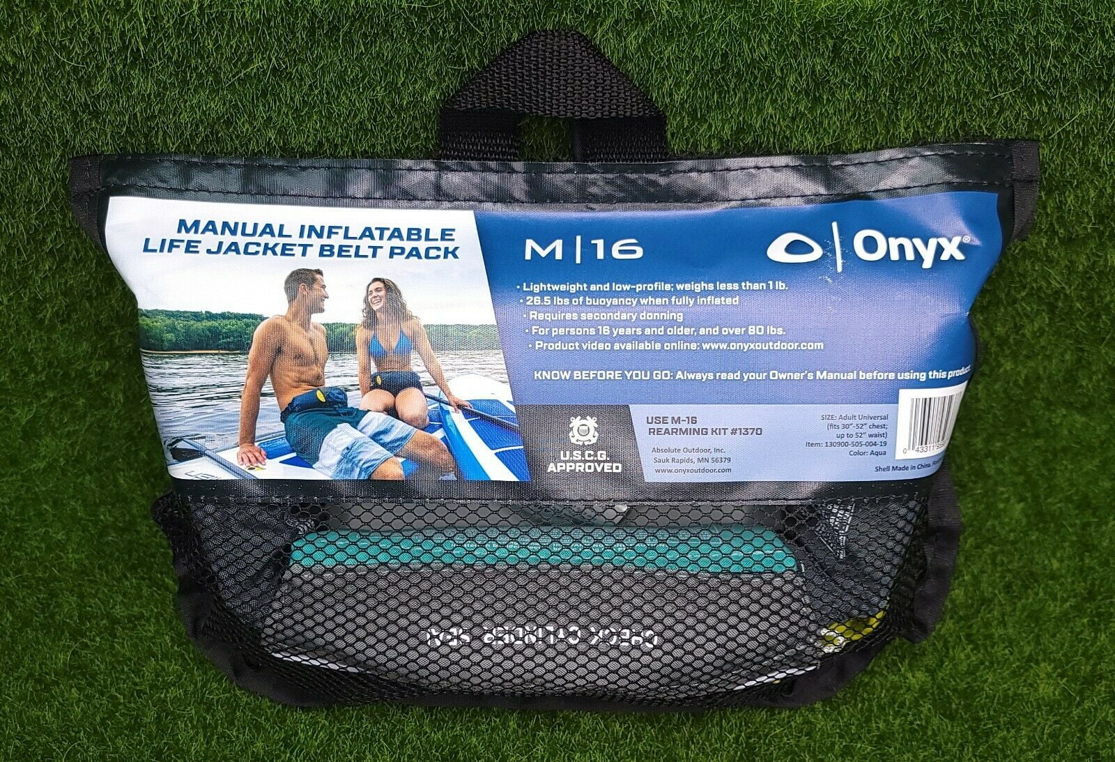 Description The Onyx M-16 Manual Belt Pack IPFD is a manual inflation life jacket where the wearer pulls the inflation handle. The 16 gram CO2 charge provides 17 lbs. of buoyancy. It is equipped with back-up oral inflation to allow the user to provide additional buoyancy up to 26.5 lbs. It features an extremely low profile and weighs less than 1 lb. The Onyx M-16 provides comfort, safety and peace of mind without knowing you have it on, until you may need it. The durable fabric resists tears and punctures. It is recommended for persons 16 years of age and older and weighing over 80 lbs. This life jacket is not recommended for non-swimmers or weak swimmers. Features Extremely low profile 1¡± buckle and body belt D-ring attachment for small accessories 200 denier nylon oxford protective cover Approved for persons 16 years of age and older; and over 80 lbs. Use M-16 Rearming Kit (#1370) U.S. Coast Guard Approved Type V Life Jacket/Personal Flotation Device PFD with Type III Performance Adult Universal ¨C Fits 30¡±-52¡± chest; up to 52¡± waist